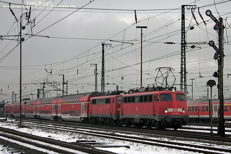 ![]() | 4 x 110 neben einander hätte fast geklappt in Friedberg auf Gleis 1 110 437 mit RB nach Giessen und auf Gleis 9 110 441 abgestellt 110 432 fährt nach Überholung von 110 406 auf Gleis 2 weiter mit der gestrauchelden 111 063 nach Frankfurt |